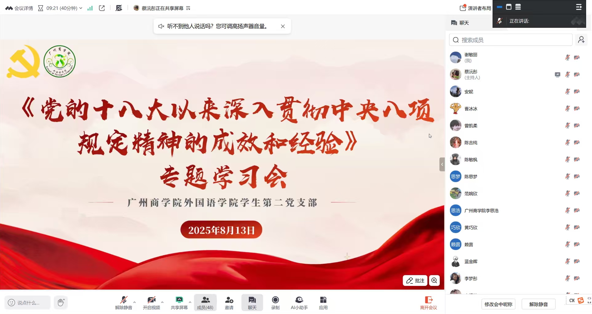 为扎实推进深入贯彻中央八项规定精神学习教育,持续强化党员对中央八项规定精神的理解与落实,进一步增强廉洁自律意识,KY开元集团官网学生第二党支部于8月13日在腾讯会议召开党的十八大以来深入贯彻中央八项规定精神的成效和经验专题学习会。本次会议由学生党员蔡沅彤主持,学生第二党支部全体党员参会。