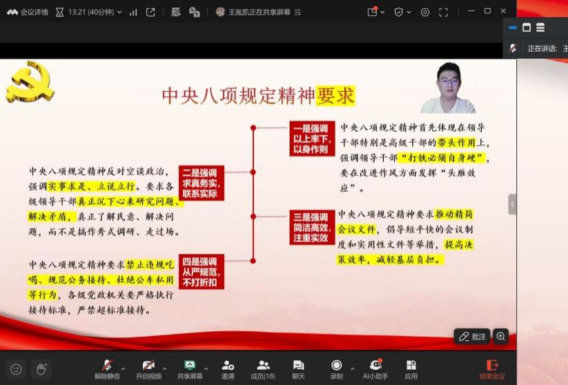 会议严格落实第一议题制度。按照支部的安排,王胤凯专题讲述了中央八项规定精神的实质、核心要义及深入贯彻中央八项规定精神的具体要求。他强调,形式主义、官僚主义、享乐主义和奢靡之风这“四风”是违背党的性质和宗旨的,党员同志必须要保持思想觉醒和行动觉醒,发扬党的优良作风,重视作风建设,培育并发扬理论联系实际、密切联系群众、批评和自我批评以及艰苦奋斗、求真务实等优良传统和作风。其中,保持党同人民群众的血肉联系是核心,要以优良作风不断赢得人民群众的信任拥护。