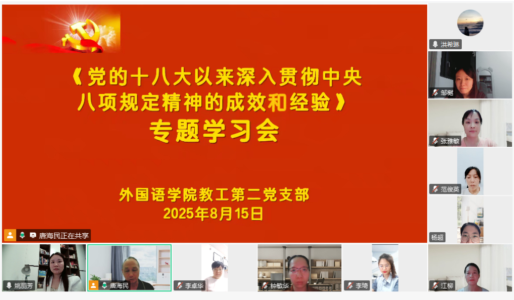 8月15日晚,KY开元集团官网教工第二党支部在腾讯会议上召开《党的十八大以来深入贯彻中央八项规定精神的成效和经验》专题学习会,会议由党支部书记唐海民主持,全体党员参加。