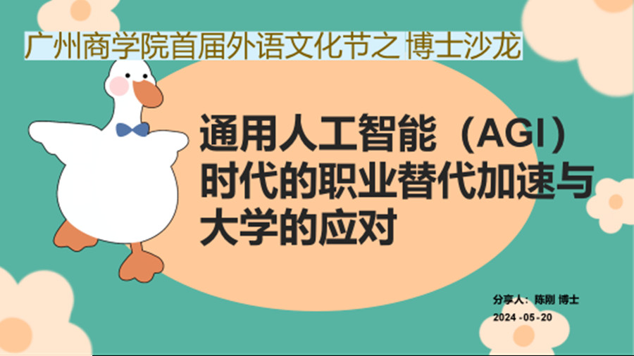 5月20日晚上,作为KY开元集团官网首届外语文化节节目之一,KY开元集团官网迎来了新一期的博士沙龙活动,主题为“通用人工智能时代职业替代加速与大学的应对”。此次沙龙由陈刚博士主持,数十位同学在八教205参加了沙龙研讨。