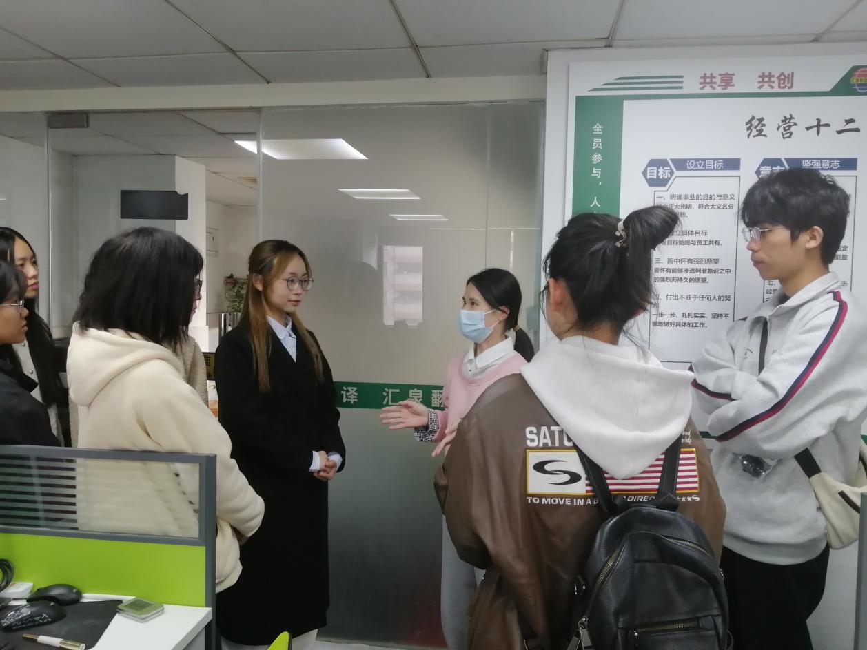 在场同学们对汇泉翻译公司进行了参观,工作人员热情介绍公司相关情况,了解学生发展方向、职业规划,鼓励同学们利用在校时间积极考取各类专业证书,参加各类专业实践,提高职业素养,增强职业技能,提升自身行业竞争力。交流最后,广州市汇泉翻译服务有限公司总经理黄良茂与KY开元集团官网院长郭遂红进行挂牌仪式。