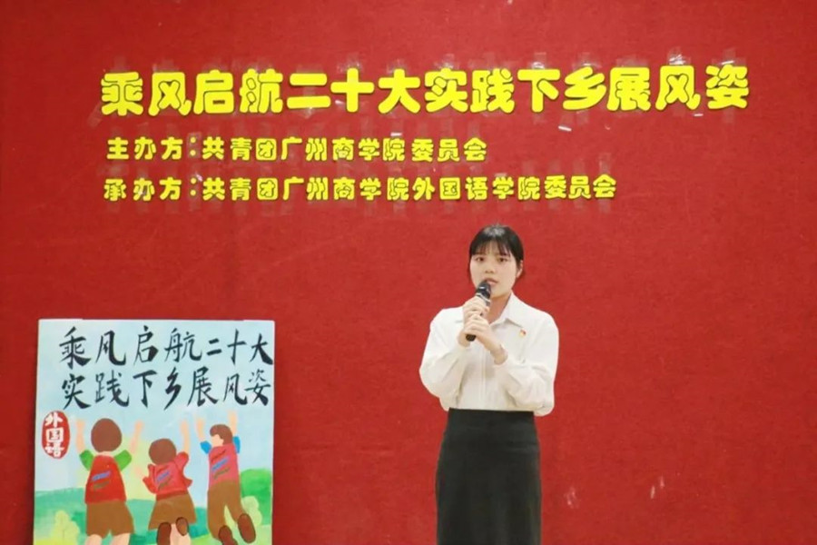 大会通过视频的形式向观众展现了外院学子在2022年暑期“三下乡”社会实践活动中的精彩风貌,他们满载志愿热情深入乡村,走进红色基地,服务基层群众,传播人文关怀,用实践向我们诠述了党的二十大精神。