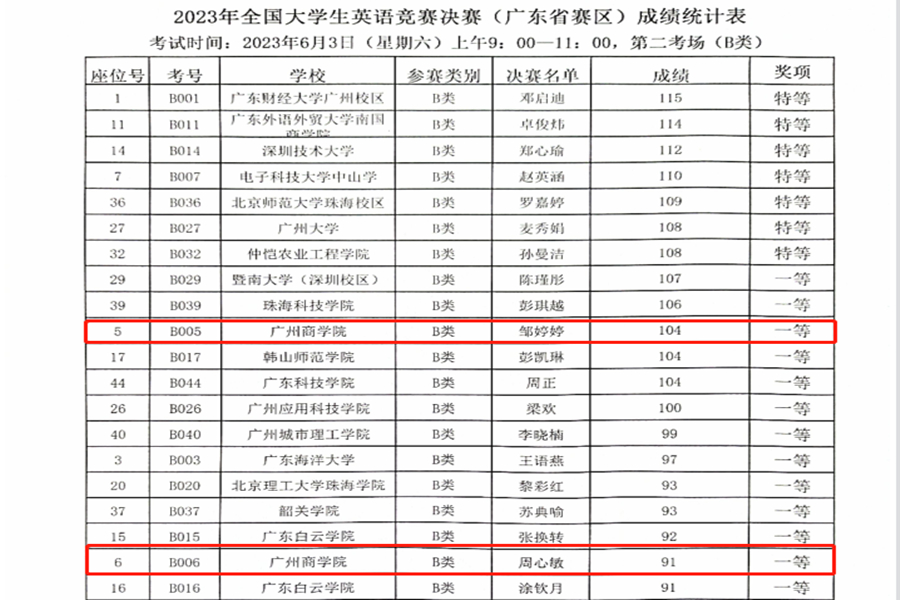 6月3日,2023年全国大学生英语竞赛(NECCS)决赛(广东省赛区)在广东财经大学拉开帷幕,KY官网KY开元集团官网李卓华老师指导的KY开元集团官网学生邹婷婷、周心敏、范隽宇、会计学院学生肖云舒、邓晔盈、信息技术与工程学院学生刘希晨、经济学院学生廖家乐以及现代信息产业学院学生陈语涵均荣获省级一等奖。
