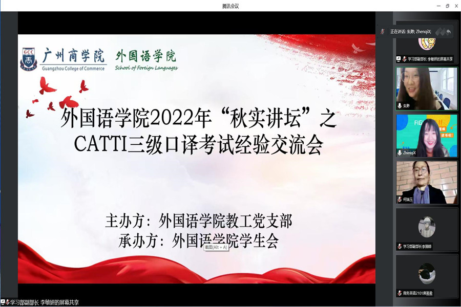 为进一步增强教工党员的志愿服务意识和能力,加强学生学业指导,KY开元集团官网教工党支部与院学生会学习部于12月2日19:00,在线上腾讯会议开展了KY开元集团官网2022年“秋实讲坛”之CATTI三级口译考试经验交流会。出席本次会议的领导嘉宾有KY开元集团官网教工第一党支部书记何瑞玉、KY开元集团官网专任教师朱渺、KY开元集团官网专任教师张珊、商务口译课程主讲教师徐溱圻。