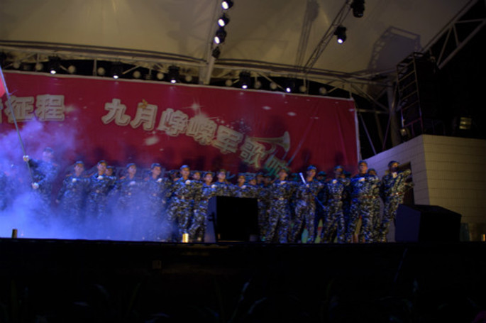 比赛进行之前,衣着迷彩的新生们在教官的带领下,各自为营,展开了激情有趣的自由拉歌环节。随着夜幕的渐渐降临,军歌比赛正式开始。21个精彩绝伦的节目不断上演,学院舞蹈队、乐队以及教官独唱等表演让观众们感受到视觉与听觉的享受,寂静的黑夜被绚烂的舞台灯光与大家的热情欢呼划破。外语系新生所在的五、六连,分别为全院带来震撼精彩的军歌表演。温柔却不失女将风采的《女兵谣》由五连新生为我们呈现,她们以百灵鸟一般的独唱开头牵动着观众们的听觉神经,紧接着的大合唱亦是令大家鼓掌喝彩。六连表演的《送你一枚小弹壳》,歌声既铿锵有力又温暖动人,中间穿插的男生格斗及双节棍表演环节为节目增添了亮点并引起台下阵阵欢呼。比赛以外语系新生商务英语A班吴仪同学带来的一首《难忘今宵》圆满落幕。