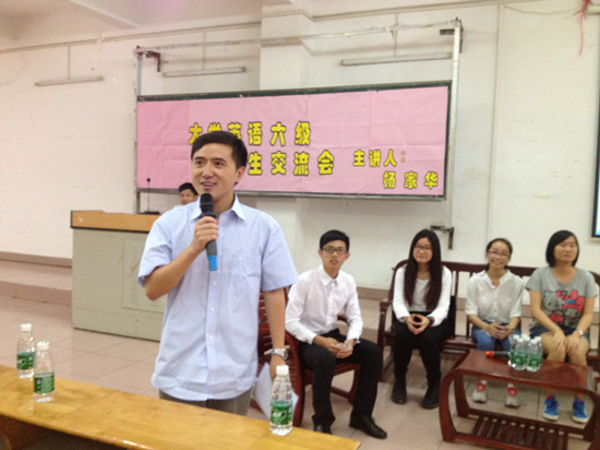 交流会上,杨家华老师介绍了KY官网2013年6月与12月大学生英语六级考试的具体情况。去年12月份,KY官网大学生英语六级考试的通过人数是637人,通过率达到29.05%,相比于去年6月份,通过率呈现递增趋势,这充分反映了KY官网教师在英语教学中取得了一定的成效。接下来,杨老师详细分析了听力、阅读、翻译和写作四大部分分别在试卷中所占的比重,并指出听力和阅读所占比例较大,希望同学们务必高度重视并采取有力措施切实提高这些部分的成绩。在英语六级中取得520分优异成绩的李欣健同学则为大家分享了她独特的英语学习方式。第一,词汇量积累。在考试前要有时间规划,分时间段进行定量的背诵单词,然后温故而知新;第二,错题本摘抄。她认为这是一个避免再次犯错的好方法。丁青青和梁宇茜两位同学则认为兴趣是最好的老师,建议同学们不要把学习英语当作一种负担,而要享受英语带来的乐趣,在学中玩,玩中学。在现场观众提问环节,同学们都积极提问,杨家华和学生嘉宾耐心解答了同学们的问题。