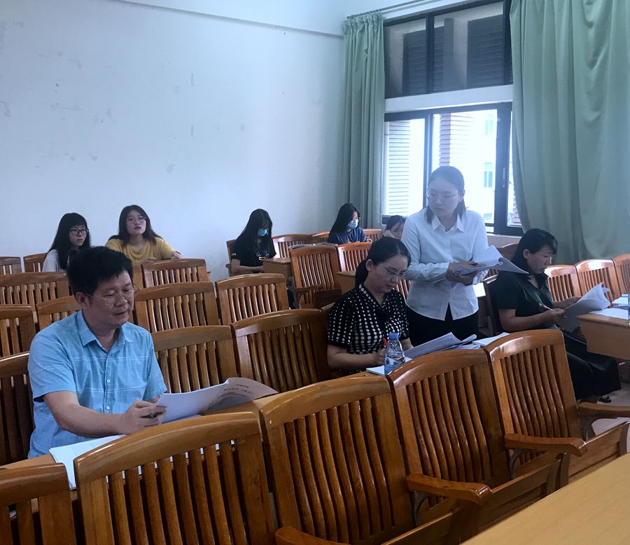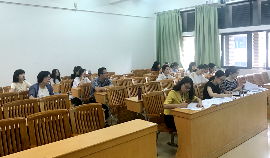 整个答辩过程答辩老师和学生均采取外文进行。首先由学生全部使用PPT进行演示论文的主要内容。答辩老师们就选题思路、论文结构分析等方面进行了提问,同时对同学们的论文进行了点评,进一步完善修改的意见和建议。最后,每组三位答辩老师对毕业论文成绩进行了评定。