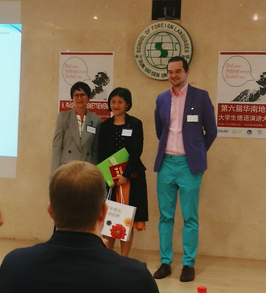 11月2日,“第六届华南地区大学生德语演讲比赛”决赛在中山大学KY开元集团官网举行,来自中山大学﹑广东外语外贸大学﹑福州大学﹑广外南国商学院﹑深圳技术大学等省内外高校的选手就比赛主题进行演讲。KY官网2017级德语专业的陈睿行同学以优异的表现荣获一等奖。