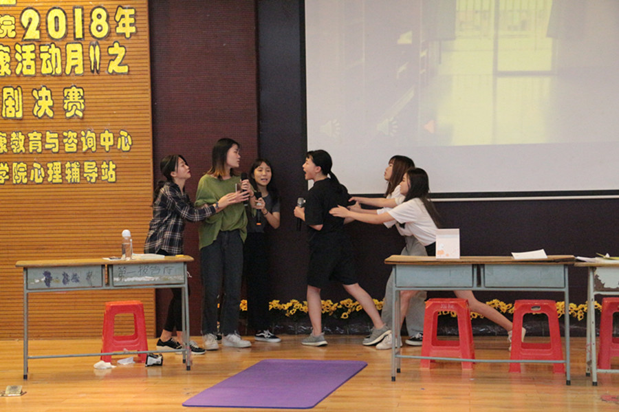 心理剧是团体心理辅导的途径之一,是采用话剧、小品、相声等多种表演形式讲述身边故事,反映大学生在环境适应、人际交往、学习生活、恋爱情感等方面遇到的心理困惑,并提出解决方法,诠释心理健康知识。大赛得到了全校学生的广泛参与,经过各学院内部的初赛选拔,共有50个作品(约350名演员)被推荐参加复赛;经审核筛选,最终共有10个心理剧入围决赛。十个作品剧情主旨多样、内容丰富。如作品《勇气》讲述了一名事事追求完美的学生干部,因不愿承认自身不足而对生活带来烦恼的故事。剧情引导学生要勇于正视自身不足,努力改进才能得到成长。作品《再爱一次》通过反映日常的生活片段,引出了与父母沟通的问题。当主人翁恍然大悟,大喊“妈妈,我很想你”时,全场观众产生了强烈的共鸣,作品感染力十足。作品《宿舍那些事》讲述了六个同学如何共同努力化解宿舍矛盾,诠释了朋辈互助的重要性。高潮迭起的剧情,演员们自然、逼真的表演,让全场时不时响起了雷鸣般的掌声。