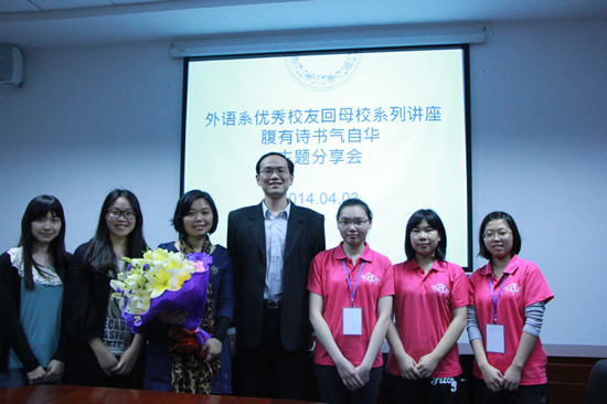 在学院喜迎十五周年校庆之际,4月3日下午16:10,外语系特邀2007届英语专业优秀校友、现任珠海市第九中学副校长邓媛媛回母校开展主题为“腹有诗书气自华,女儿当自强”主题分享会。本次主题分享会在第二行政楼308举行,外语系党总支书记徐超、系办公室主任贾琼、系学生会指导老师黄玉亭等参加了本次主题分享会,外语系及兄弟系的师生的积极参与本次活动。