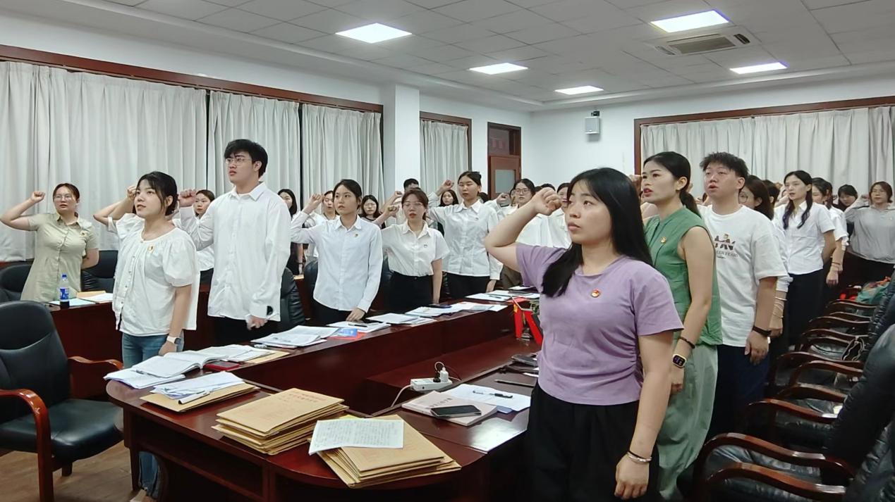 蔡文蝶带领全体党员进行入党宣誓。入党誓词激励着党员同志们坚守入党初心、坚持砥砺前行,在今后的工作与生活中做到为民服务、勇于担当,勇当先锋,不断前行。