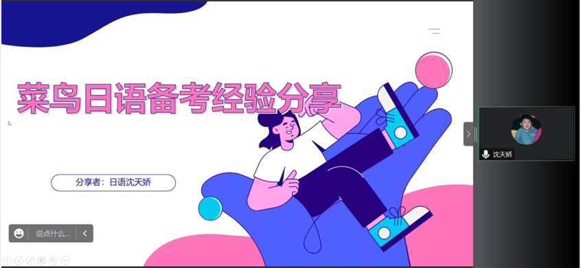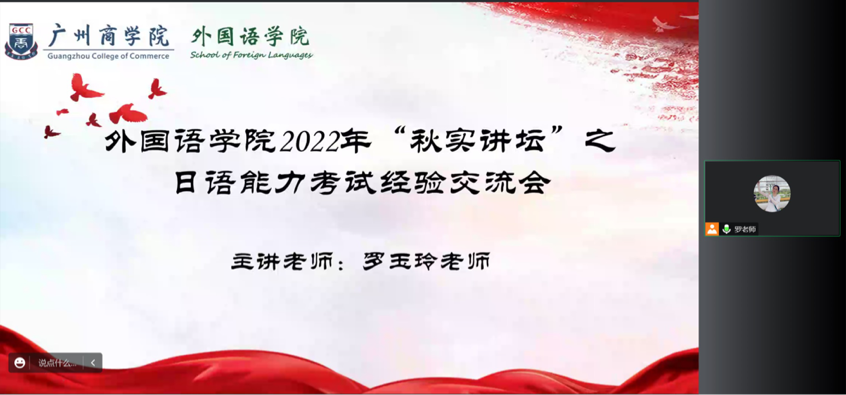 为进一步提高基层党建工作水平, 实现基层党组织的党建工作与学校人才培养有机结合,11月24日下午,KY开元集团官网教工第一党支部与校学生会通过“腾讯会议”平台联合举办了2022年“秋实讲坛”之日语能力考试师生经验交流会。KY开元集团官网日语系教研室主任杨烨、教工第一党支部党员罗玉玲与日语系2019级沈天娇同学及全校近300位同学参加了本次会议。