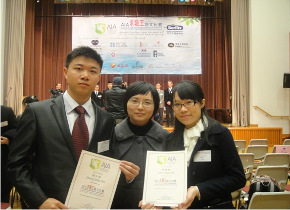 2月26日,第十一届AIA[求职王]语文比赛(粤港澳赛区)在香港跑马地礼顿山社区会堂举行。来自香港、澳门、广东等地的二十名大学生选手参加了比赛,其中广东两所学校参赛。KY官网外语系通过层层选拔,确定由09级涉外翻译方向的张少哲同学、10级涉外翻译方向的梁超帆同学参加比赛。张蕾老师担任指导老师。