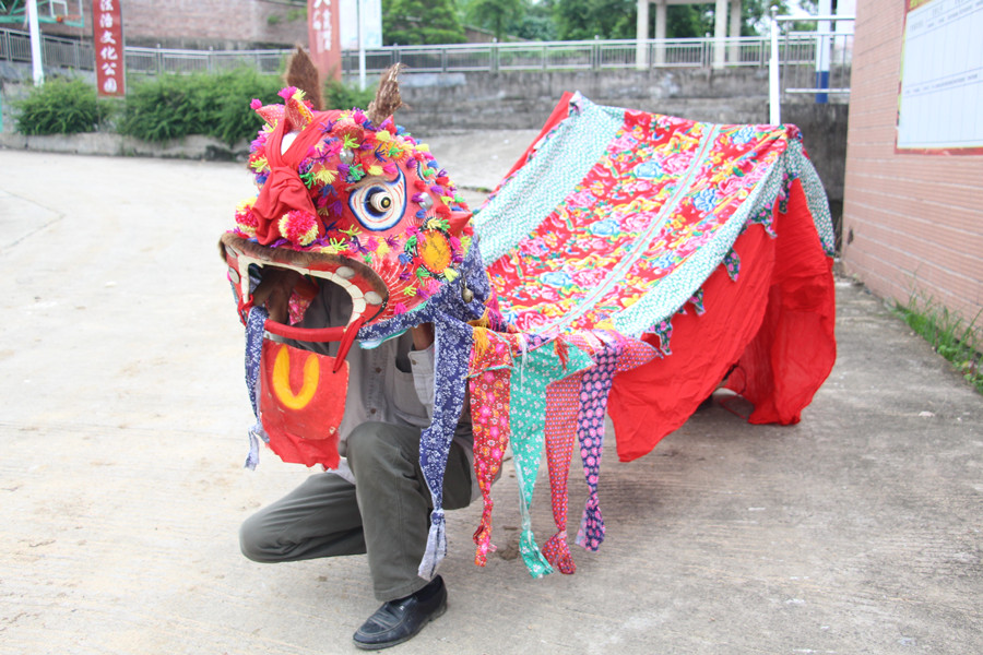 在文南村盘龙围,队员们一同走近具有英德特色的市级非物质文化遗产——客家鸡公狮舞,鸡公狮外形似公鸡,面似狮虎,在清远周边的县市区广为人知,经常受邀参加节庆、祭祀等活动。据随行的蓝宗参主任介绍,客家鸡公狮舞有着250余年的历史,特色在于其舞步以及独特的鼓乐:以锣、小锣、镲为主,小鼓伴奏。鸡公狮模仿公鸡的轻盈步伐,舞狮人罩着镶彩色布拼成,尾部碎花红底棉布的狮被,像有着华彩羽毛和艳丽尾巴的公鸡在飞舞。凡是过时过节或农闲的时候,有着丰富经验的舞者就会组织村里的小朋友和青少年,以长带幼练习舞鸡公狮,以团队的感染力,互相影响和学习,让“非遗”获得了良好地传承。