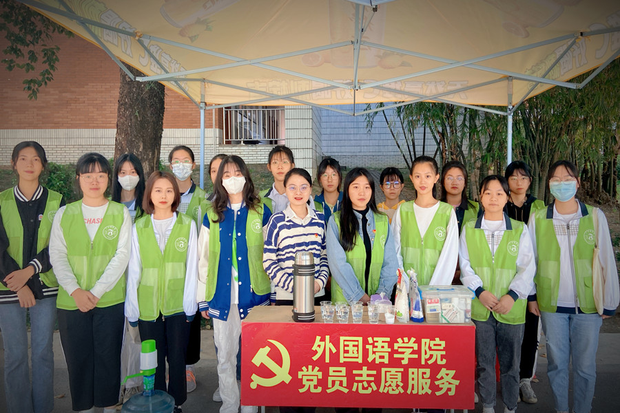在体测开始前,19级学生党支部的党员、发展对象、积极分子和21级学生党支部的入党申请人在谢清玲老师的组织下有序集合,设立服务岗,并完成志愿服务前的准备工作。在准备过程中,各同学合理分工,如搭建帐篷、准备药品及饮用水等。体测进行时,志愿者们来回奔波于服务岗和跑道之间。他们及时为完成体测的同学送去热水,为身体不适的同学提供葡萄糖水、纸巾、药品等物资,搀扶体力不支的同学到休息处进行放松调整。