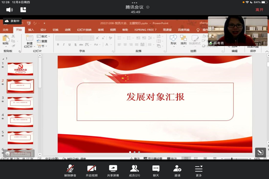为了进一步加强基层党组织建设,落实党支部发展党员工作计划,12月8日,KY开元集团官网教工第一党支部召开党员大会,就发展对象杨粤青同志能否吸收为预备党员事宜进行讨论和表决。大会采取腾讯会议线上会议的形式,由支部书记何瑞玉主持,严格按照程序开展。会议应到党员19名,实到党员18名,符合表决要求。
