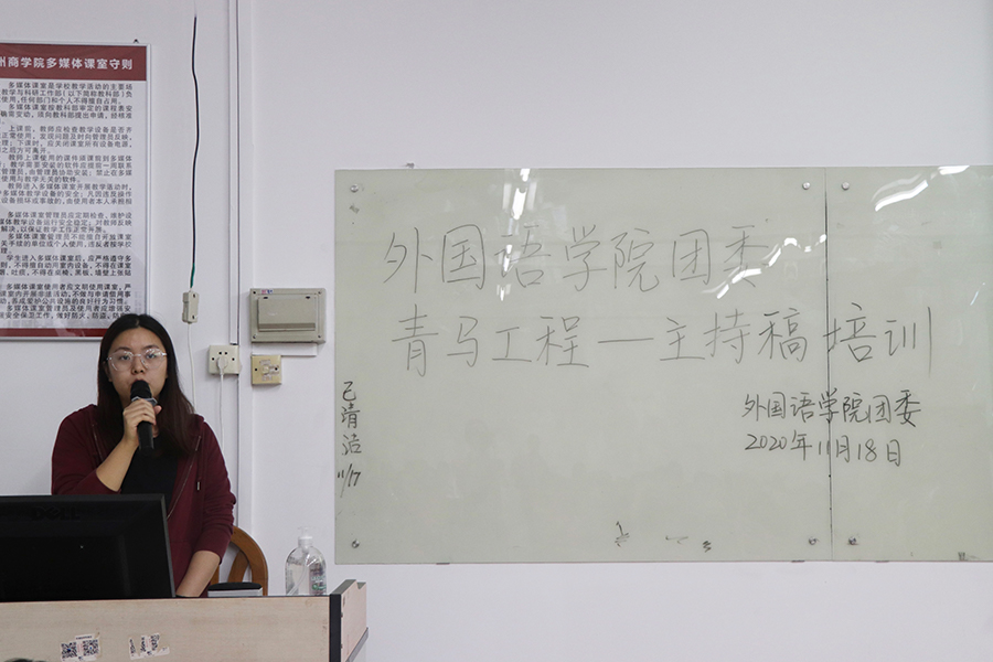 首先,团委权益部部长梁颖贤向团学固定志愿者详细讲解了主持稿的嘉宾与评委的称谓、主持稿内容流程及注意事项,让固定志愿者们更加清楚地了解如何撰写一份规范及优秀的主持稿,为以后的工作奠定良好的基础。