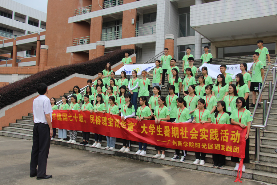 为深入学习贯彻习近平新时代中国特色社会主义思想,学习贯彻党的十九大和十九届二中、三中全会精神,引领教育广大青年学生在切实感受新中国成立70周年取得的巨大成就中增强“四个意识”、坚定“四个自信”、做到“两个维护”,在加强志愿服务中增强责任感和使命感,在社会实践中受教育、长才干、作贡献,以实际行动投身打赢脱贫攻坚战,投身乡村振兴战略实施,勇做担当民族复兴大任的时代新人,KY官网阳光展翅实践团于 7月9日奔赴清远英德市东华镇文南小学开展为期九天以"欢庆建国七十载,民俗瑰宝谱华章"为主题的大学生暑期社会实践活动。出发前队伍特地举行了出征仪式,学院党总支书记徐超发表了讲话,实践团指导老师刘万里、郑灿玲,辅导员黄玉亭、刘丽萍、戴玮也出席了本次活动。