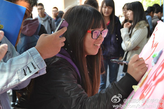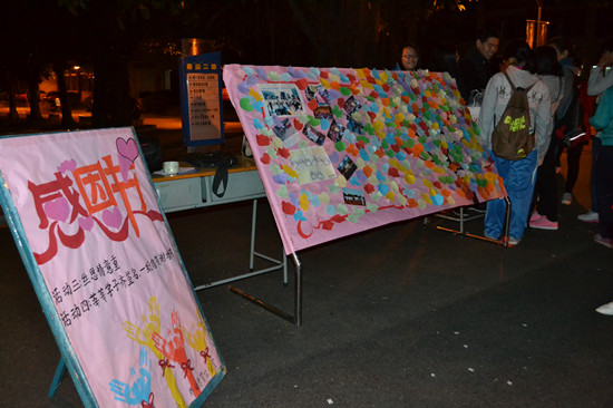 在“社团之爱伴我行”作品征集活动中,参与者以照片捕捉社团活动的温情瞬间,或是用漫画定格社友的动人画面,每份作品都传递了作者对社团浓浓的感恩之情;在“爱你在心口难开”书信代寄活动中共向父母、老师、朋友、同学等对象代寄了65张明信片,30封书信。轻轻的一张明信片,短短的一封信,承载了同学们的心中的爱与感恩之情;在“丝丝情意重”活动中,300多条红丝带承载着外语系同学们浓浓的感恩之情在校园中随风起舞,红丝带为在讲台上的倾情相授的老师拂走了辛苦,为在生活中一起努力奋斗的朋友带去了感动,为在寒风中坚守岗位的保安叔叔捎去了温暖,为在宿舍楼下尽职尽责的宿管阿姨捎去了感谢……在“莘莘学子齐感恩,一纸信笺谢增院” 活动中,广大师生在小小的信笺上写上了对增院满满的祝福,简短的语言深情而不乏味,感动夹杂着温情。