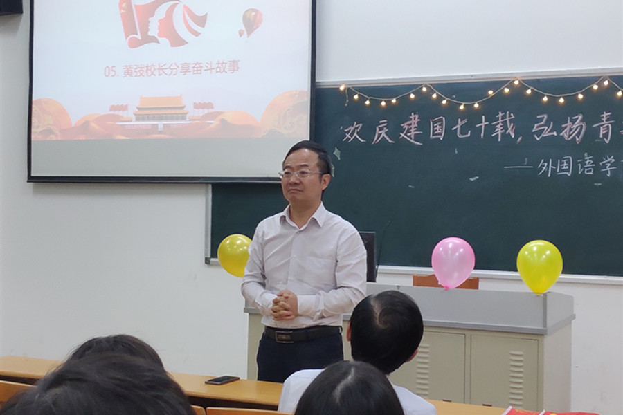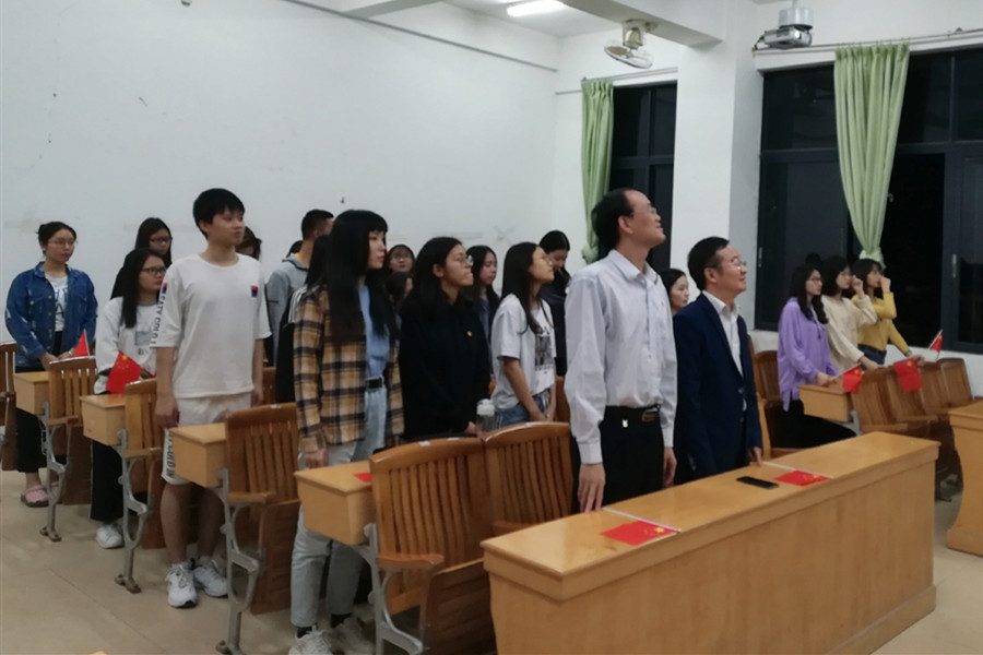 为庆祝中华人民共和国成立70周年,弘扬当代青年爱国精神,树立报国之志,推进“不忘初心、牢记使命”主题教育工作,KY官网17级英语2团支部于11月14日晚在四教111开展了以“欢庆建国七十载,弘扬青年爱国志”为主题的团日活动。班级结对子老师黄弢校长、学院党总支徐超书记、辅导员郑灿玲老师出席活动,班会由团支书林晓莉主持。