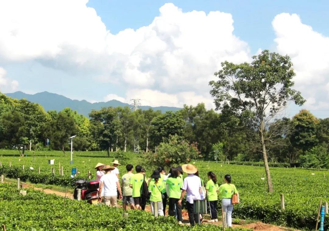 首先,阳光展翅实践团跟随着解说员走进生产车间外的走廊,解说员对着外廊上的每一张照片细心地讲解其背后的故事,从英德红茶种植历史、特色民俗、制作红茶的匠心路到八百秀才品牌建立,带领大家进入了那段历久弥新的岁月里。紧接着,阳光展翅实践团前往红茶园。未到茶园,先闻其香,放眼望去,茶树遍野满山。伴着茶香,解说员向队员们介绍英德红茶的生长环境、采摘技巧和不同红茶品种的种植培育方式。最后,茶艺师现场给队员们展示了泡茶的全过程。