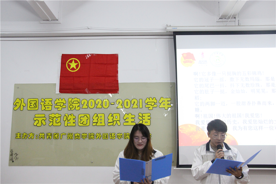 答疑完毕后由商英1801团支部的刘敬一和刘建兴同学为我们带来《青春与祖国》诗朗诵,抑扬顿挫的音韵伴随着激昂的音乐,体现出对祖国的热爱。