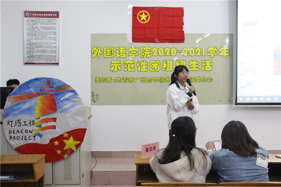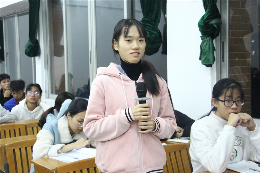 紧接着,曾带领团支部斩获省级“百优项目”的优秀团支书代表吴曼曼同学为我们分享她在“中华人民共和国成立70周年”为主题的团组织生活中所取得成功的经验。她主要从主题意识、团员参与和PPT制作这三个方面向同学们分享,重点讲解了PPT可以通过快闪等不同形式来展示。