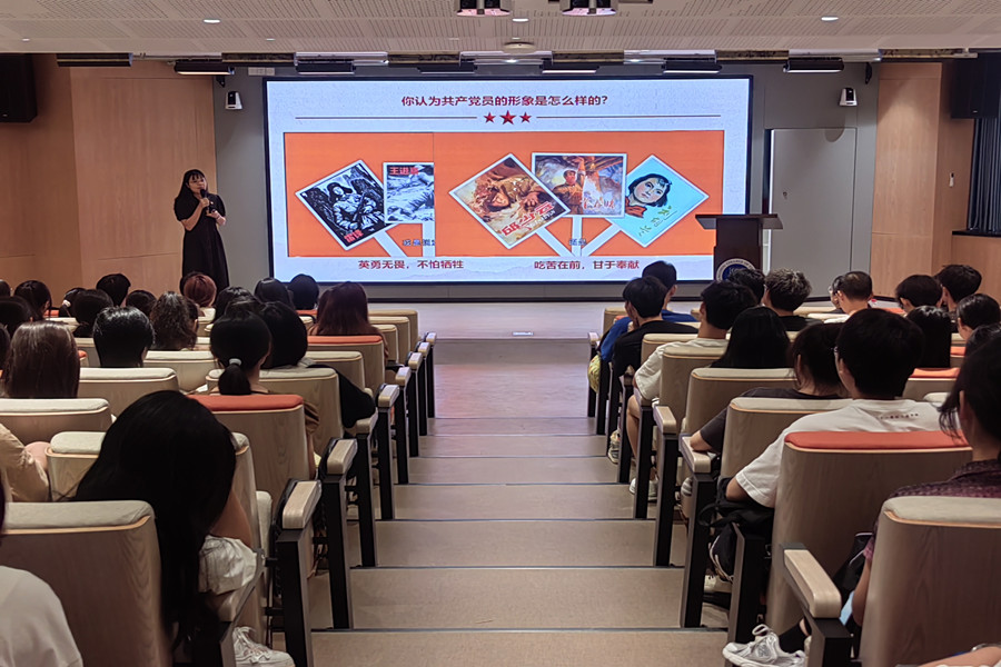 蔡文蝶和谢清玲以“你认为共产党员的形象是怎样的”为切入点,阐述了中国共产党的性质,同时引出了为什么要入党、如何入党、入党的成长过程,并分别从这三个重要方面向新生进行讲解。