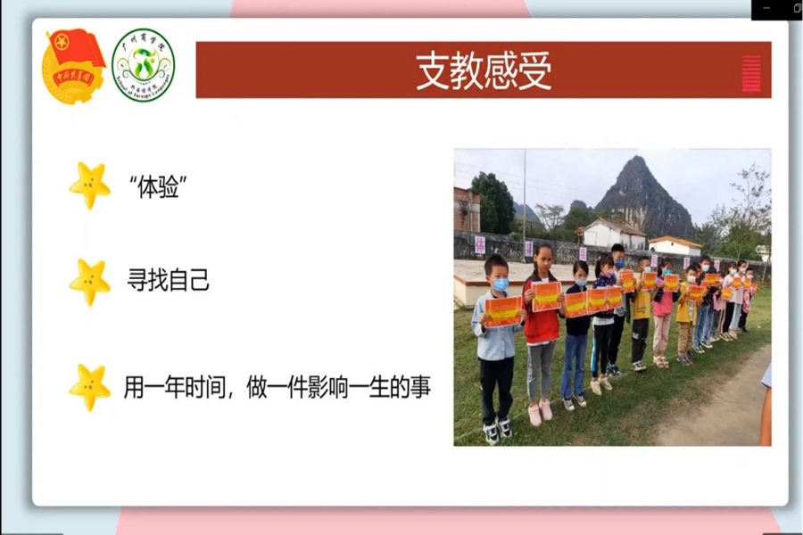 杨月娣从前期的就业迷茫,在工作中失去方向为切入点,阐述了为什么选择参与到“西部计划”中成为一名支教志愿者。在一年多的服务时间中,她从体验,价值与意义3个关键词为主的,带领同学们走进了她的支教生活。
