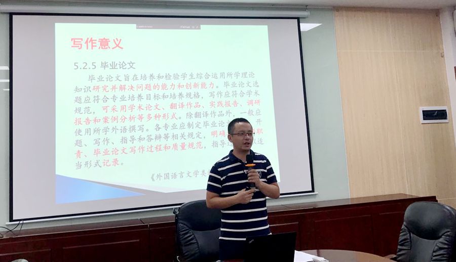 德语专业大会由系主任周昳旸主持,日语专业大会由日语系主任杨烨主持,两位系主任主要阐明了论文写作在本科教育中的重要意义,向学生介绍了写作的流程、时间安排、分数构成和其它注意事项。英语类指导老师动员大会由KY开元集团官网副院长袁鑫主持召开,马蔚兰院长和全体英语类毕业论文指导教师参与此次动员大会。袁鑫副院长首先介绍了本届毕业论文的总体情况,包括毕业生人数、指导教师人数和毕业论文工作的“七个阶段”,梳理了毕业论文指导的重要时间节点。由于今年有三分之一的指导老师是新教师,袁鑫副院长对于本科毕业论文写作的意义和指导策略进行系统地阐述,并提出具体要求。他结合《外国语言文学专业国家教学质量标准》阐释了毕业论文写作对于本科生能力培养和教师专业发展的重要意义,指出毕业论文写作目的是综合考查学生创新能力、解决问题能力和沟通能力,体现了外语专业本科教育的重点,也是本科教育质量评估的核心指标之一。随后,袁鑫针对《KY开元集团官网毕业论文(设计)管理办法》中的“指导教师职责”部分做出详细说明,总结出“定范本、重选题、抓过程、要面谈、有耐心”的论文指导策略,同时也加强对指导老师在论文指导管理过程中的文件规范、指导规范、评语规范等问题提出了详细要求。最后,袁鑫副院长以“心素则安,心暖则柔”总结此次会议,希望指导老师们以负责之心对待工作、以育人之心对待学生,化负担为机会,在指导过程中不断提升自己的教学水平和专业水平。