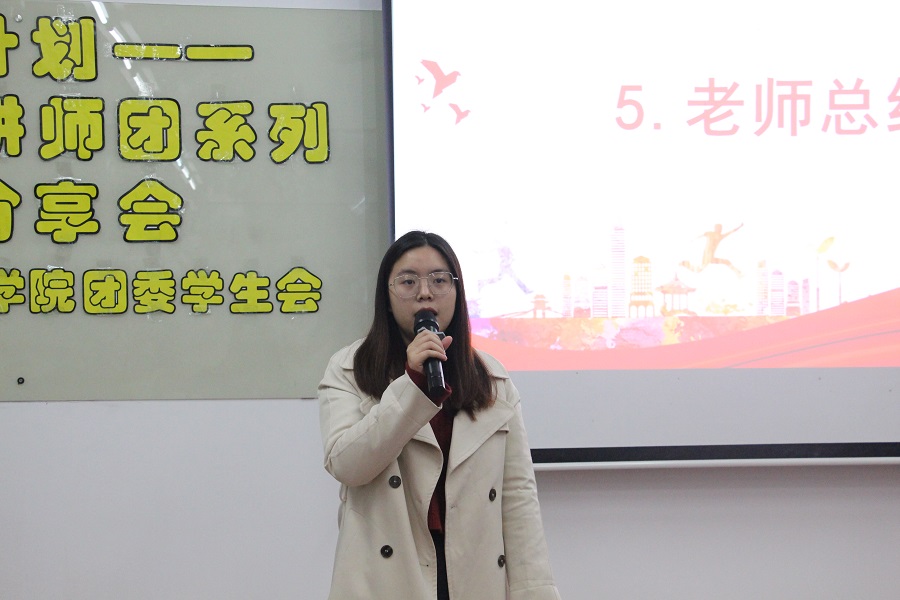 最后由赖雯慧老师进行总结发言,她向同学们说明目前各大高校支持大学生积极参加社会实践与创新创业以提高大学生的实践能力,旨在为社会培养应用型人才,与社会进行良好对接。她强调,同学们应该主动尝试了解,把握锻炼自己能力的机会。此外,她又分享了自身在社会实践中的经历,鼓励同学们能积极利用创新创业丰富的资源与平台,培养自身的独立性与创造性。