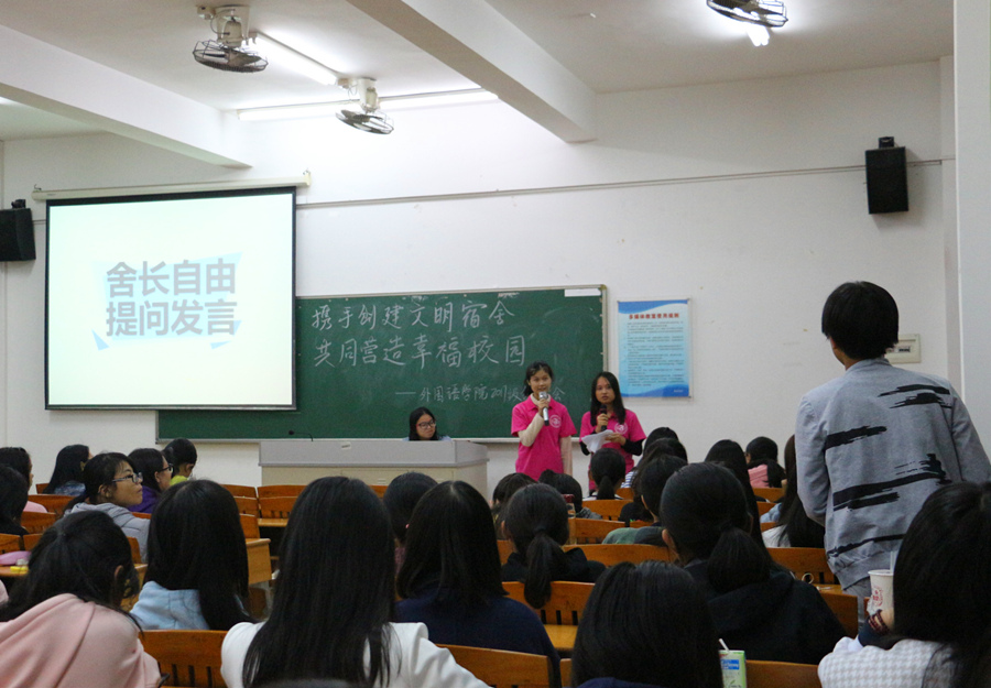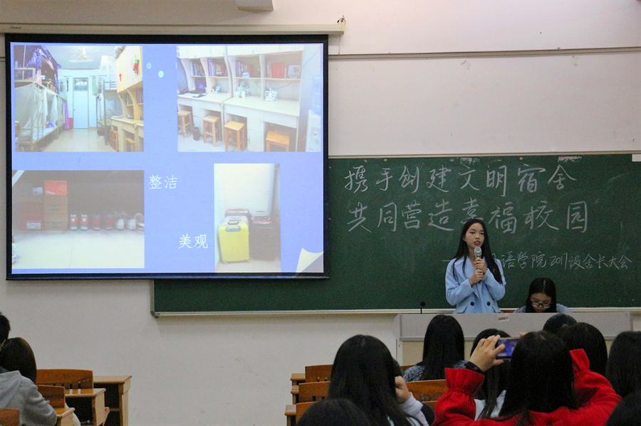在大会上,生活部的干部首先向17级的各位舍长介绍了宿舍管理制度和公寓管理工作评优制度,此外还详细说明了学校评选“星级宿舍”、“优秀学风宿舍”、“文明宿舍”和“优秀舍长”的标准,让各位新生舍长更加明确了各项细则,提升了同学们为营造良好的宿舍氛围的信心。随后,16级优秀舍长代表李翠柳分享了一年半以来与舍友共同生活的点点滴滴,其中包含了宿舍内部的建设、管理方法等内容,通过舍友的共同努力,该宿舍获得了学校“星级宿舍”、“优秀学风宿舍”等荣誉称号。活动的最后环节,很多新生舍长也就目前各自构建文明宿舍过程中遇到的烦恼和困扰进行了提问,在场的老师和干部也为他们进行了很好地解答。