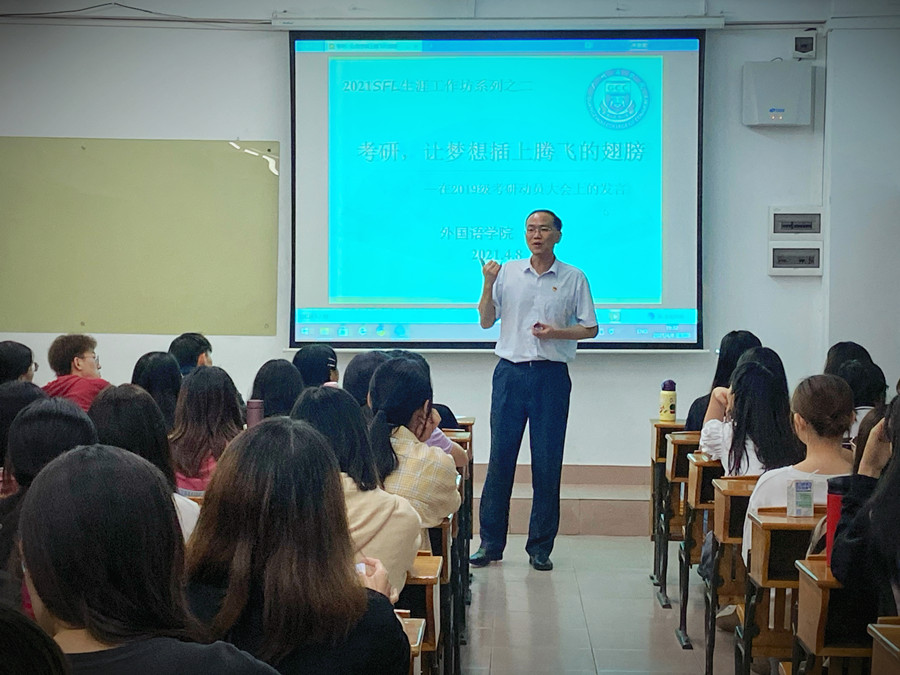 徐超指出,当前就业形势越来越严峻,考研竞争越来越激烈,备考难度也越来越大,各位同学应该尽早准备,学院将在人、财、物、政策等全方位助力各位同学顺利考研。他向同学们分享了2021届考研喜讯,并从中提取了师兄师姐考研历程中走过的弯路和值得借鉴的地方,希望同学们能够根据自身实力理性选择考研院校、专业和区域,树立目标坚持目标并且高度自律方能如愿考上心仪的学校。接着,徐超对学术型硕士和专业型硕士做了全方位比较,推荐了几个考研常用网站,并以华南师范大学为例手把手教同学们正确查找考研招生简章、招生目录、考试科目和考研参考书籍等信息。然后,徐超为2019级同学们清晰地梳理了考研复习流程,2019级学生目前应该在收集信息和考虑自身实力的基础上尽早确定意向专业和学校,着手准备购买相关复习资料进行第一二轮备考,2022年8-9月全面备考,全力征战2023届考研。最后,徐超强调,考研征程漫漫,复习很苦也很累,也许与高三相比,并不轻松多少,各位同学要树立足够的考研信念、坚守奋斗、自律苦读,坚持到最后才能有机会成功,诚挚地祝愿所有同学考研成功!