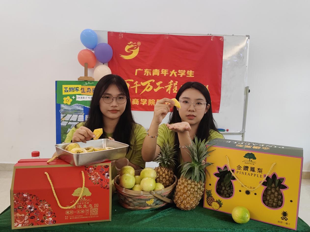直播添韵,叫响生态园。为扩大亚维浓生态园的传播范围和受众覆盖面,为生态园创造更多新受众群体。阳光展翅实践突击队积极创新宣传形式。团队精心策划并开展了两场直播活动,一场是精彩纷呈的农产品水果直播,带观众领略了生态园中新鲜美味的水果金钻凤梨及黄金百香果;另一场是趣味盎然的户外游园直播,带领观众畅游亚维浓生态园,让更多游客体验到生态园的迷人之处,增加生态园新受众群体。两场直播累计吸引了 5000 余名观众观看,收获了 25 万的点赞量,极大提升了亚维浓生态园的网络热度和话题度。