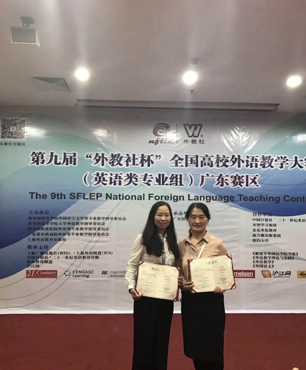 2018年10月27日,由教育部高等学校外国语言文学类专业教学指导委员会、教育部高等学校大学外语教学指导委员会、教育部职业院校外语类专业教学指导委员会、广东省本科高校外语类专业教学指导委员会和上海外语教育出版社联合主办的“广东省2018年本科高校外语教学大赛”暨“第九届‘外教社杯’全国高校外语教学大赛(广东赛区)”决赛在广东技术师范大学举行。KY官网的邵春发老师和任青老师经过复赛的激烈角逐,顺利进入各专业组的前十名,从而进入决赛,并以优异的表现最终分别获得了“英语专业组”和“商务英语专业组”的二等奖。