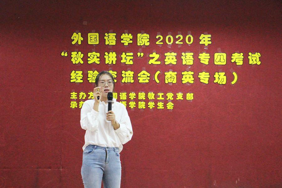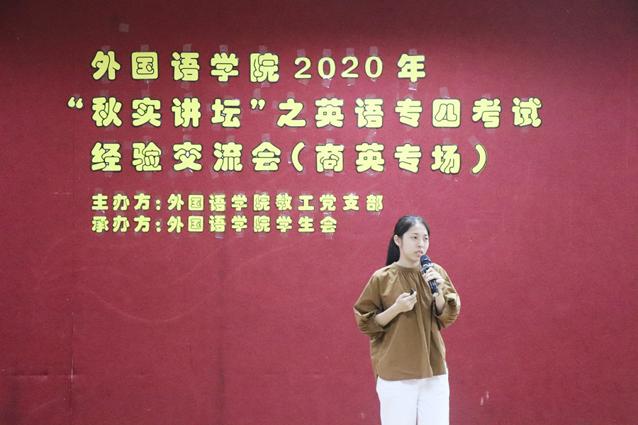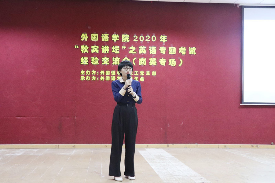李海燕简单介绍了“春华秋实”讲坛的创设缘由,并从英语专业四级考试流程,应对策略以及参考资料等三个方面为同学们解读英语专四考试的基本情况。李海燕提出,要养成框架意识,学会分析句子结构,善于积累,及时输出,并向强调了专四备考过程中团队协作的重要性。此外,她还嘱咐在场的20级学生,重视语法,有效利用学院专门开设的语法实践课,为专四考试提前准备。