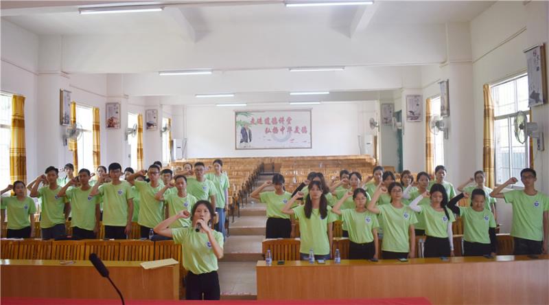 仪式上,周校长为本次活动致辞。他主要介绍了观音阁中学的基本概况并希望志愿者们能在此次活动中有所收获,在校园“法”与“德”文化氛围的浸染下有所感悟。随后,指导老师刘万里发表了讲话,他对镇团委书记和校长等人的大力支持表示了感谢,并希望志愿者们能够遵守规章制度、保护好校园环境、注重人身财产安全,并时刻展现大学生应有的风采。周校长和刘老师的致词,对每一位志愿者而言,不仅是一种鼓励,更是一种鞭策,让每一位志愿者更加明白了各自的责任。紧接着,全体志愿者在实践团队长杨俊娜的带领下进行宣誓。志愿者们愿尽己所能,服务基层和社会,为建设和谐社会贡献智慧和力量。活动尾声,镇团委书记彭秀君向大家分享了两个故事,启迪着志愿者们在下乡过程中除了要提升自身素质,还要在学生中树立一个好榜样,随即宣布“三下乡”活动正式开幕。