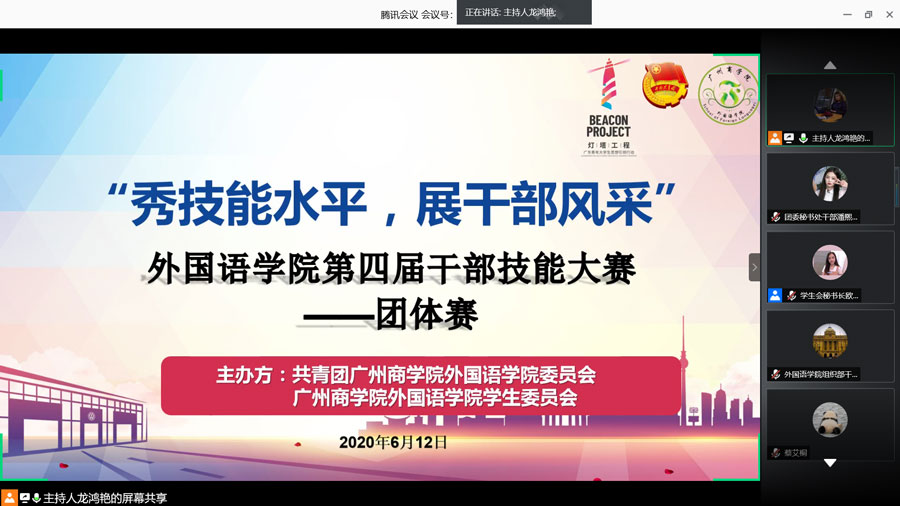 6月12日19:30KY官网通过腾讯会议开展第四届干部技能大赛团体赛决赛,担任本次大赛评委的有院团委书记刘万里、院学生会指导老师伍思颖、团委副书记丁玮、团委组织部部长陈京华以及学生会主席黄雨珊,同时出席本次大会的嘉宾的有院17级辅导员刘丽老师、院17级辅导员黄士库老师、院19级辅导员刘丽萍老师以及院团委书记处和学生会主席团成员。