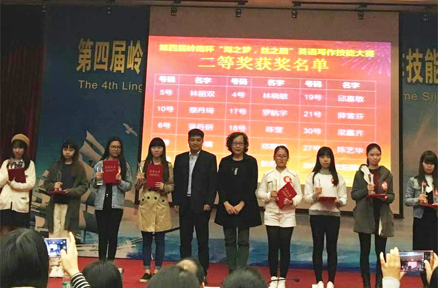 12月3日,第四届岭南杯“海之梦,丝之路”英语写作技能大赛复赛和决赛在华南师范大学隆重举行。在领队老师李卓华和指导老师黄景全、伍彩芬、田晶晶的带领下,KY官网共有7名学生前往参加比赛,其中4名同学以出色的表现,分别荣获得二等奖和三等奖。KY开元集团官网2015级德语专业的罗航宇同学以复赛第二名的成绩顺利进入决赛,并且获得了公共英语本科组的二等奖;电子商务管理学院2014级的李小慧、2015级的张榕桂和黄惠悦三位同学荣获公共英语本科组三等奖。此外,KY开元集团官网的英语老师李卓华、黄景全、伍彩芬、田晶晶获优秀指导老师称号。