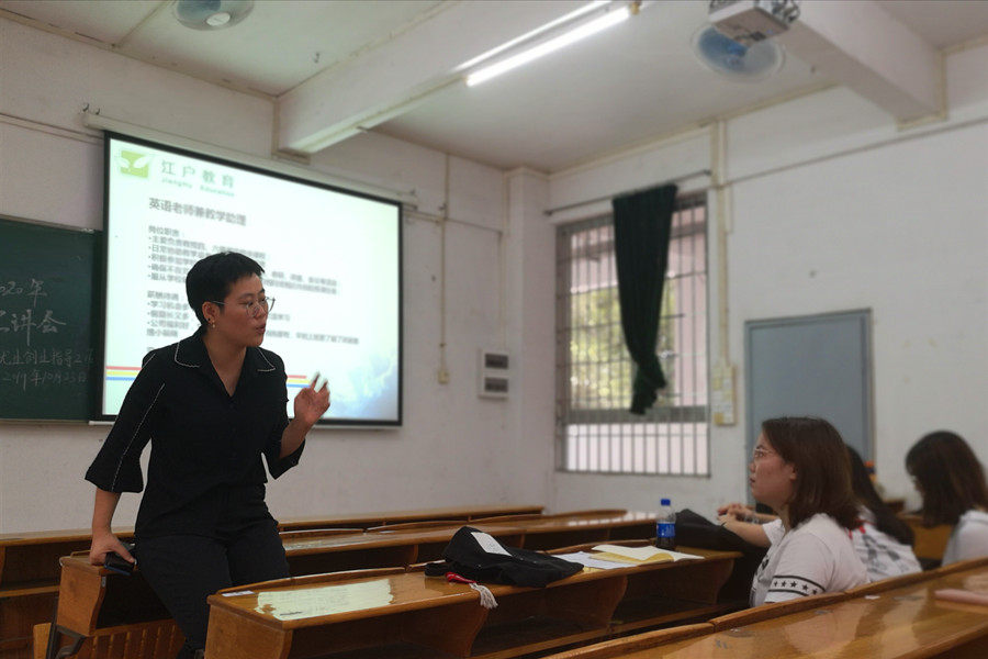 宣讲会开始后,梁雅瑜为到场的同学们讲授了就业求职中的小技巧,包括简历的信息编辑与版面设计、应聘着装的要求、与HR的有效互动方式等。期间,为了让同学们更加自信地上台展现自我,现场组织了一次自我介绍和相互介绍的模拟面试,老师们根据每位同学的表现予以点评。随后,江户教育校长安娜详细分析了当前外语教育的行业发展势态,介绍了该教育机构的成长历程、岗位需求、员工成长体系等,并为同学们解答疑问。
