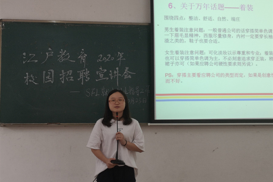 为深入贯彻落实“不忘初心、牢记使命”主题教育,做好2020届毕业生就业创业工作,10月23日下午,KY官网就业创业指导工作坊诚邀江户教育前来三教106开展2020年校园招聘宣讲会。江户教育校长安娜、人力资源专员梁雅瑜、毕业班辅导员戴玮、郑灿玲和部分日语、英语、德语专业的毕业班学生参加了宣讲会。