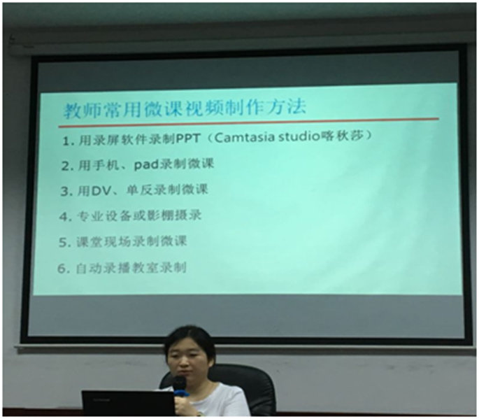 在本次活动中,赖老师介绍了微课制作的要点和方法,并根据自己制作微课的经验,讲解如何通过通过录屏、DV、课堂现场等不同微课软件来制作微课视频。赖老师认为,微课之“微”在于四个要点:简洁、精炼、透彻和深刻;而微课之“简”则通过界面、用图、讲解、文字来体现;在制作微课过程中,须涵盖五个步骤:分析、设计、制作、应用和评价,并要把握好微课设计的度。微课虽然在前期制作中需要花费不少的时间,但是微课设计可以帮助教师提炼教学难点和重点,思考如何结合教育学和二语习得理论,设计教学环节,让学生易于理解,提高教学的有效性,也符合目前“互联网+”教育模式的发展趋势。合理使用微课资源,一方面可以提高教学效率,另一方面也可以促进教师的科研。活动最后,赖老师给大家演示了如何用喀秋莎、Prezi、Powtoon和手绘纸片教师常来制作微课。