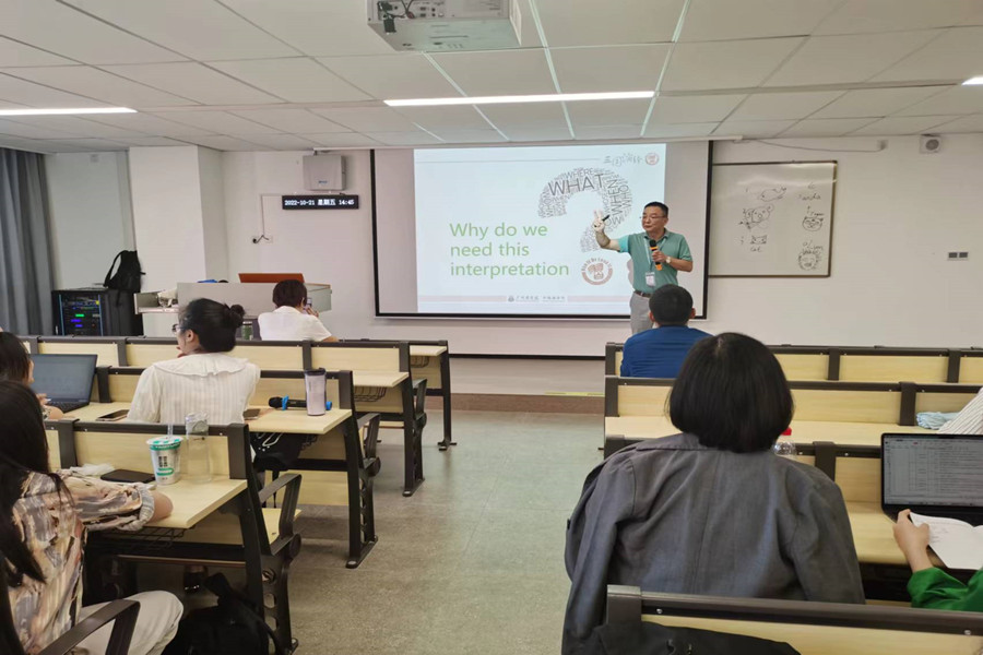 袁鑫首先指出了本次会议的目的在于解读教学比赛评分标准,促进教师用评分标准指导课堂教学,他希望全体新教师能够通过此次培训,掌握课程教学的基本组织原则和各环节的教学方法,实现课堂教学的规范化。陈刚对评分标准进行了解读。他改变通常的讲座方式,结合课堂教学方法,通过多种模式与在座的教师进行互动,并在过程中分析自身在课堂管理和教学方法上出现的各种问题。他指出teachers are trained professionals, 一位合格的教师必须掌握一定的教学理念和教学技巧,其专业性都是要经过一段时间的训练才能具备。评分标准不仅用于比赛评分,同时也是对课堂教学环节规范的描述体系,对于指导教学有较强的指导意义。陈刚详细分析了评分标准的各个构念及其参数,具体要求体现为:1、教学档案应规范美观;2、教学目标适切、明确;3、教学设计具有高阶性、创新性和挑战度;4、课堂管理能够实现师生的良性互动;5、教学过程系统高效;6、具有较高的技术素养;7、教学效果良好,学生乐学会学。