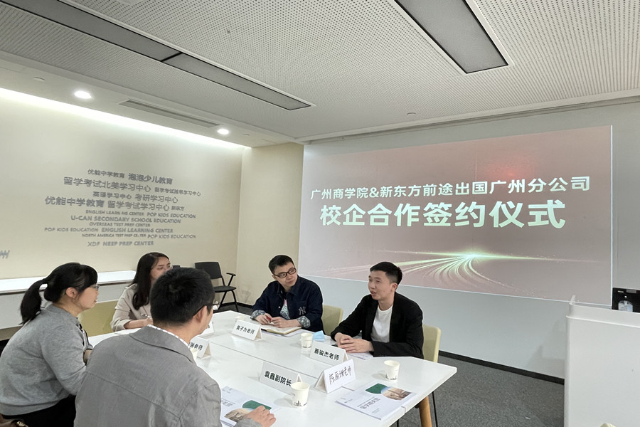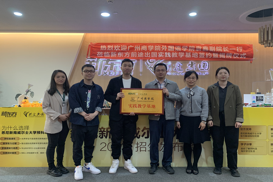 随后,袁鑫等一行前往北京新东方前途出国咨询有限公司广州分公司,总监蔡骏杰对公司的岗位情况和主营业务等进行介绍,并带领参观了公司的工作环境。袁鑫代表学校向新东方前途出国授“实践教学基地”牌匾,介绍了毕业生的基本情况,围绕促进专业建设、人才培养模式、员工考核机制、项目合作、实践基地建设等方面进行深入交流。