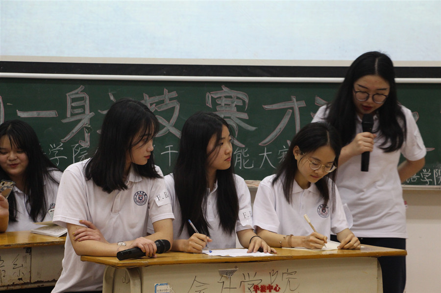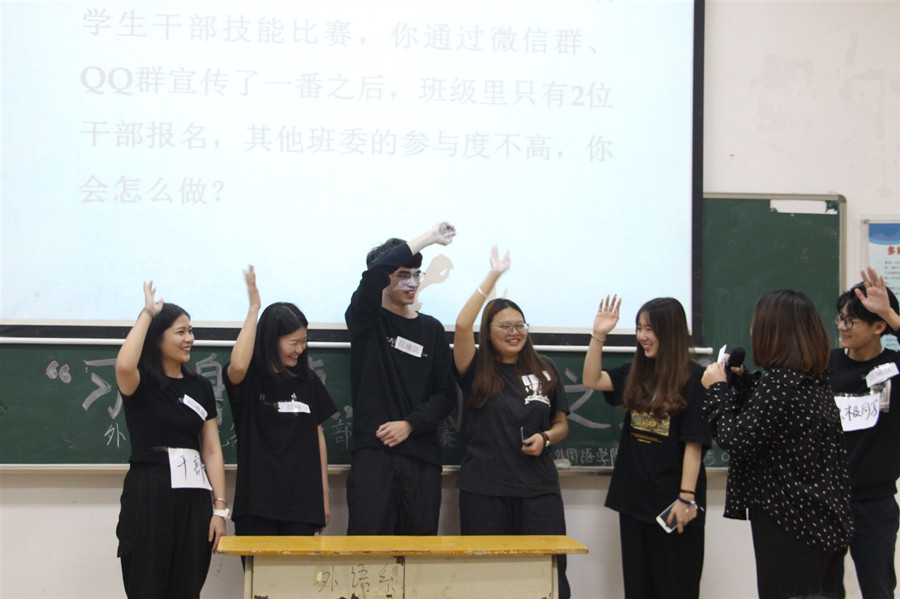 此次大赛遵循KY官网学生干部培养思路,以“德智体美劳”五大模块为考核环节,赛制分为个人赛和团队赛,个人赛已于前期完成,现场为团体赛比拼。大赛伊始,各组队员根据特长,借助歌曲演唱、情景剧等载体展示了干部团队的风采。第二环节是知识竞答,意在考验干部们对时政热点及基本办公技能的掌握能力,各组选手集中精神,踊跃抢答,各组比分交替上升。信息概括与传达是学生干部必备技能之一,在第三环节里,现场所有干部一起参与其中,共同完成通知编辑与讲解。第四环节最具专业特色,以中英文诗歌互译形式考查选手们的专业水平,很好地活跃了赛场氛围。第五环节则围绕“班级学风建设”、“宿舍卫生检查”等日常工作内容开展情景模拟,选手们发挥才智与经验进行作答,展示了学生干部的应急管理能力和语言表达能力。
