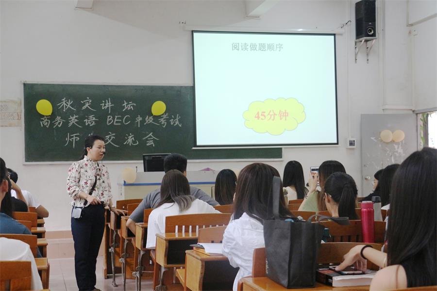 伍彩芬首先向与会学生介绍了BEC等级考试的简介、考试形式以及证书含金量等基本情况。紧接着,在向同学们下发真题基础上,通过逐题讲解的方式,深入剖析了出题思路与解题技巧。阅读部分,在总结了考生常犯的对文章推敲过深、忘记按先易后难的顺序做题等误区的基础上,向同学们提出了相应的对策,推荐了合适的做题顺序。口语部分,建议同学们多多积累商务英语方面的口头表达。考试时,尽可能的放平心态,将自己的观点表达清晰,并结合KY官网学生的实际,向大家推荐了几本练习BEC中级口语考试的书籍。听力部分,则强调了答案需要全部大写的细节,也强调了听力应有的做题顺序。在讲座尾声,伍彩芬主动下台和同学们进行互动,耐心地解答了同学们的疑虑与担忧。通过本次讲座,资深教师和蔼的态度、丰富的经验以及专业的水平大大增强了与会同学的通过考试的信心。