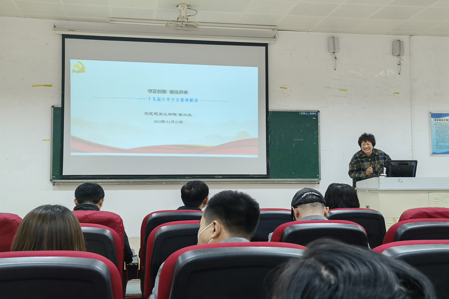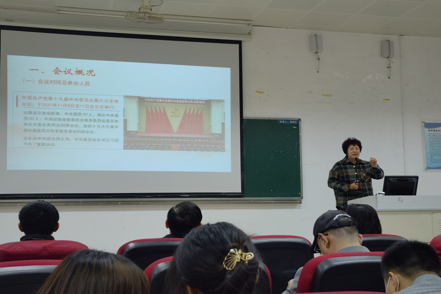 张小兰从会议概况、核心要义、学习贯彻等方面详细介绍党的十九届六中全会精神,重点解读全会审议通过的《中共中央关于党的百年奋斗重大成就和历史经验的决议》(以下简称《决议》),引领与会师生在学思践悟中提升理论修养。张小兰认为,党的十九届六中全会是在“两个一百年”奋斗目标历史交汇关键节点上召开的一次重要会议,要认真学习宣传全会精神,务必牢记“中国共产党是什么、要干什么“这一根本问题,明确党确立习近平同志党中央的核心、全党的核心地位,确立习近平新时代中国特色社会主义思想的指导地位的重大意义,深刻认识习近平新时代中国特色社会主义思想是当代中国马克思主义、二十一世纪马克思主义,是中华文化和中国精神的时代精华,实现了马克思主义中国化新的飞跃的理论内涵,重点把握党在四个历史时期奋斗历程、五大历史意义、”十个坚持“的宝贵经验以及全会决定中国共产党第二十次全国代表大会于2022年下半年在北京召开等主要内容。张小兰指出,高校师生要把党的十九届六中全会精神落实到立德树人的实践过程中,为国家和社会的发展培养德才兼备的应用型本科人才。
