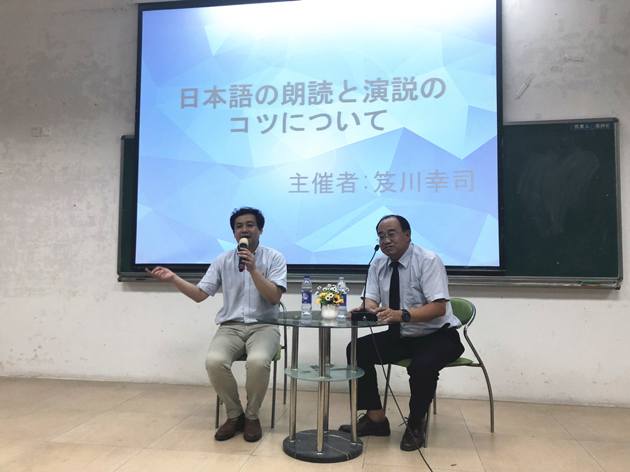 笈川教授在讲座中,细致地讲解发日语演讲中发音及表述上的注意事项,并根据日本的文化给在场的同学讲解在与日本人交往时日常中要注意的事项。笈川教授强调,要学好日语,要经常激励自己,自我鼓励。笈川教授的演讲声情并茂、慷慨激昂,睿智深刻的语言与幽默诙谐的动作不时引发哄堂大笑,不仅让同学们轻松愉快地学习了知识,也让讲座在活跃的氛围中划上了圆满的句点。