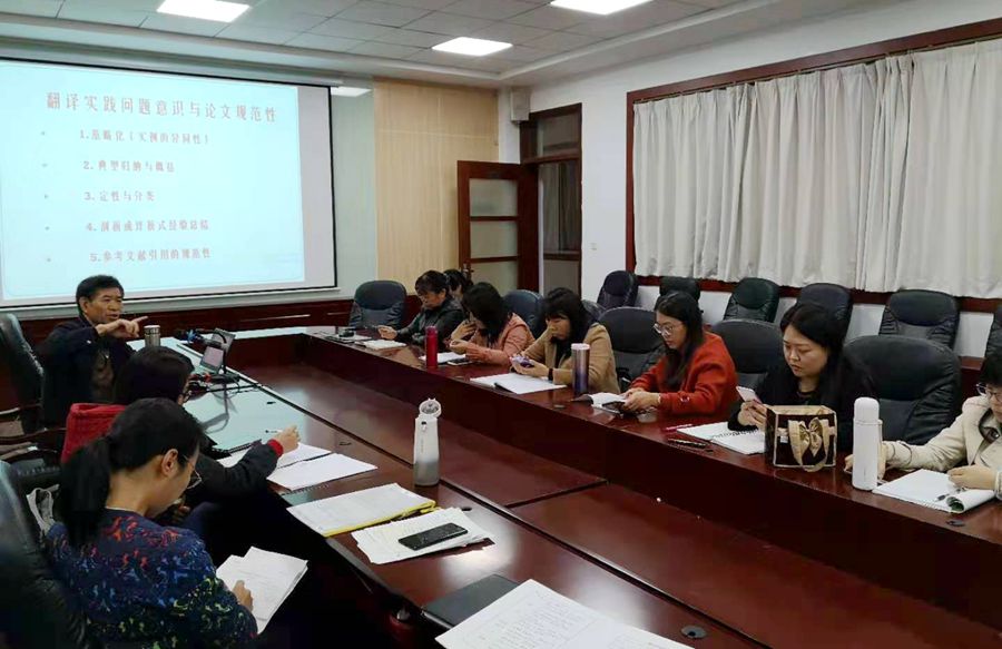 接着,曾教授提到语境与词语搭配性选择的问题,并以“克服”一词的英译为例,讲解了一词多译的主客观理据,并提出学生在汉译英时容易发生母语迁移,因此在翻译过程中要注重概念内涵形象的突显性和生动性,并以习近平总书记系列重要讲话中隐喻的翻译为例,强调概念意涵的语境适切性。除此之外,曾教授还总结了一些其他的翻译经验,比如概念内涵的情态突显性、概念内涵的认知关联性、概念内涵的语境嬗变性以及概念内涵搭配的经验逻辑制约性等。同时曾教授再一次强调了提前分配论文导师的重要性,希望能把论文指导和写作改造成师生协作、生生协作的相得益彰的模式,从而提高论文指导效果和效率。