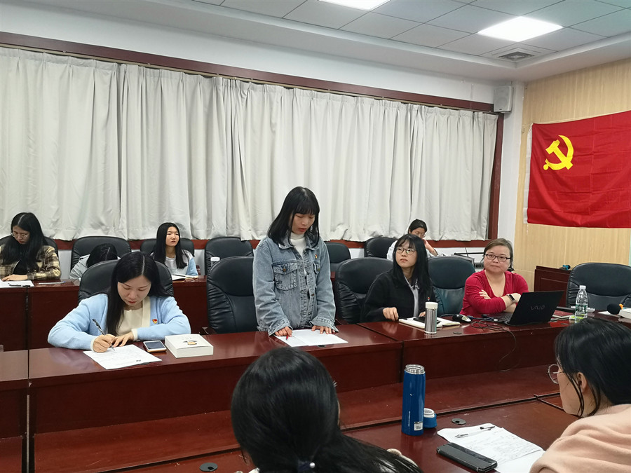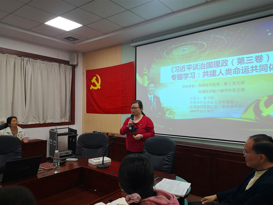 潘文晗声情并茂的讲述深深地打动了每一位在座党员的内心,引起大家热烈讨论。教工党支部的范俊英、薛俊洁分别结合具体事例讲述了自身对人类命运共同体的认识和体会,同时也对外语专业的党员同志们寄予厚望,希望学生党员同志们在构建人类命运共同体的大环境下能有一番作为。随后,两名学生党员也分享了自己参与本次党课学习的心得体会。
